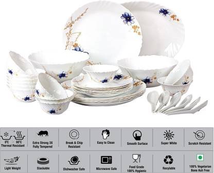 Package Contents: 6-Pieces Full Plate, 6-Pieces Quarter Plate, 6-Pieces Veg Bowl (190ml), 2-Pieces Medium Serving Bowl (1.37 Litres), 1-Piece Oval Platter, 6-Pieces Soup Bowl (290ml), 6-Pieces Soup Spoons, 1-Pieces Small Serving Bowl (790ml) and 2-Pieces Multi Utility Bowl (510ml)
