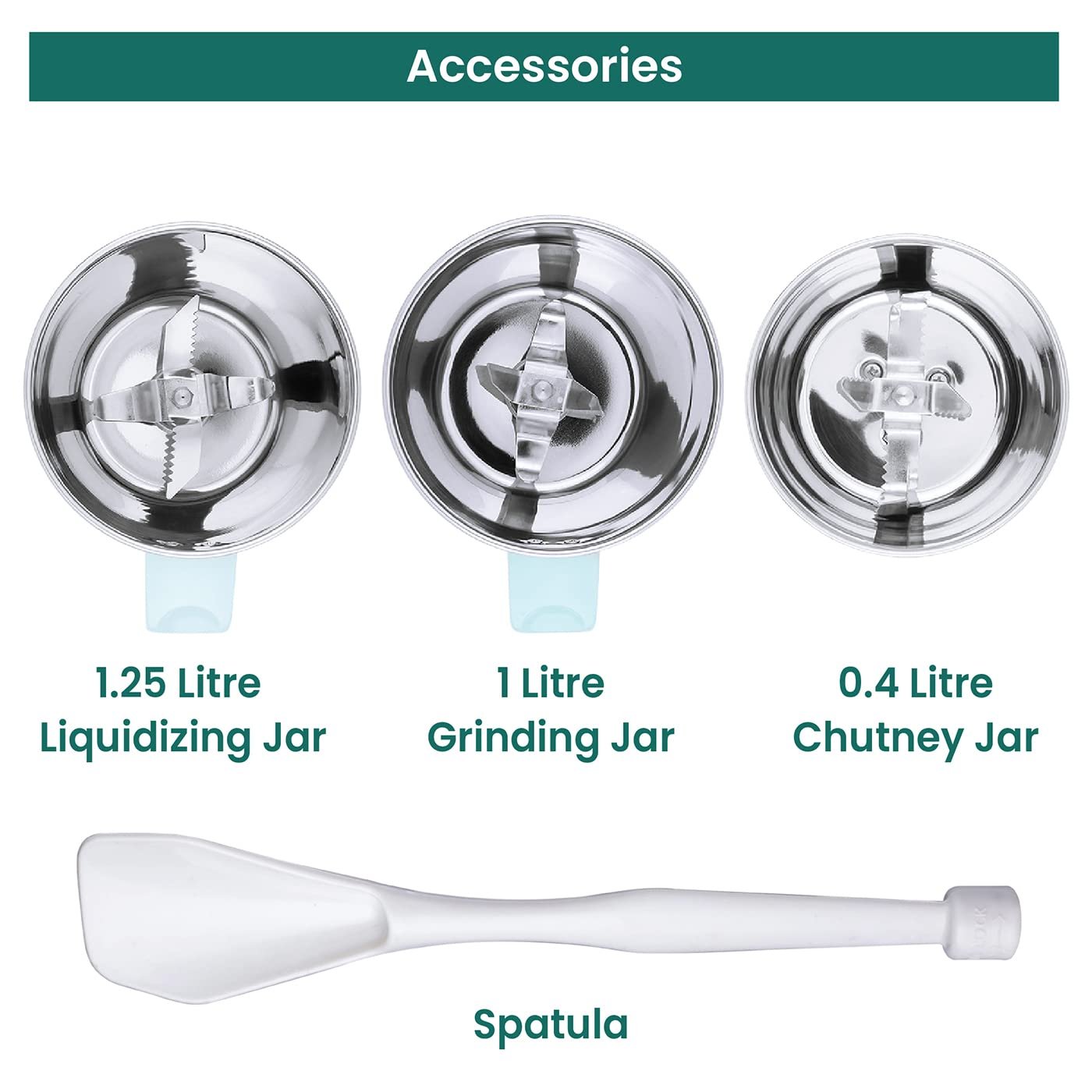 • 3 detachable stainless steel jars with polished blades for fine grinding ( Wet & Dry Grinding Jar (1 Liters), Liquidizing & Blending Jar (1.25 Liters), Chutney Jar (0.4 Liters)) with transparent lids for maximum grinding performance; Transparent PC dome lid for liquidizing and grinding jar; Multifunctional blade system; The jars are leak-proof for spill-free grinding experience; Blade Material : Stainless Steel ; Body Material: ABS body