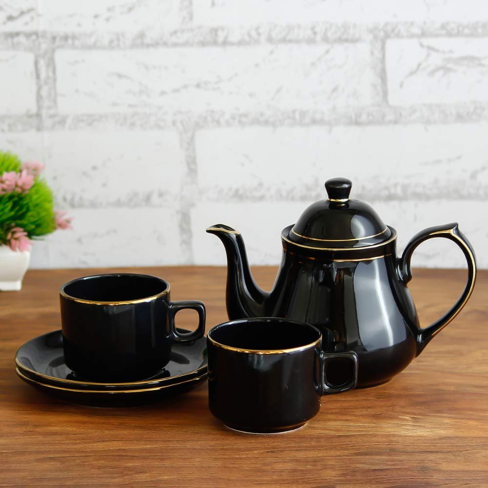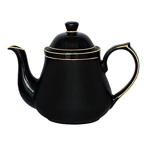 Femora Indian Ceramic Fine Bone China Gold Line Black Tea Kettle Tea Pot for Office, Home, 1pc, Serving for 3 Black