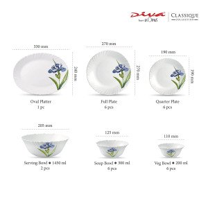 • Package Contents: 6N Full Plate (270 mm), 6N Quarter Plate (190 mm), 6N Veg Bowl (180 ml) , 6N Soup Bowl (340 ml),1N Oval Platter (330 mm), and 2N Serving Bowl (1450 ml)