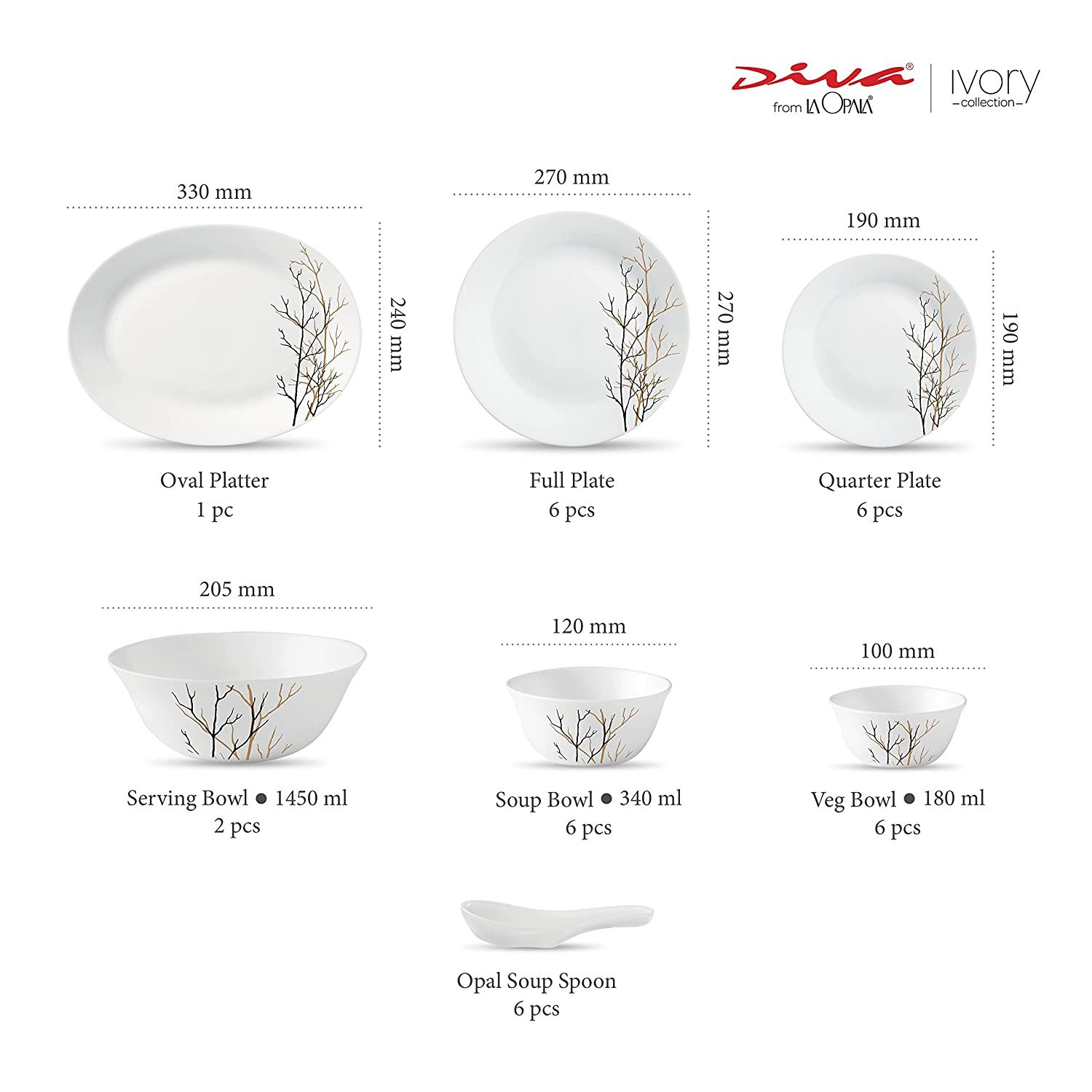 - Package Contents: 6N Full Plate (270 mm), 6N Quarter Plate (190 mm), 6N Veg Bowl (180 ml) , 6N Soup Bowl (340 ml), 6N Spoon, 1N Oval Platter (330 mm), and 2N Serving Bowl (1450 ml)