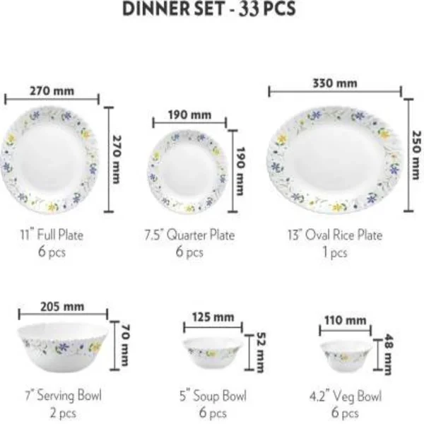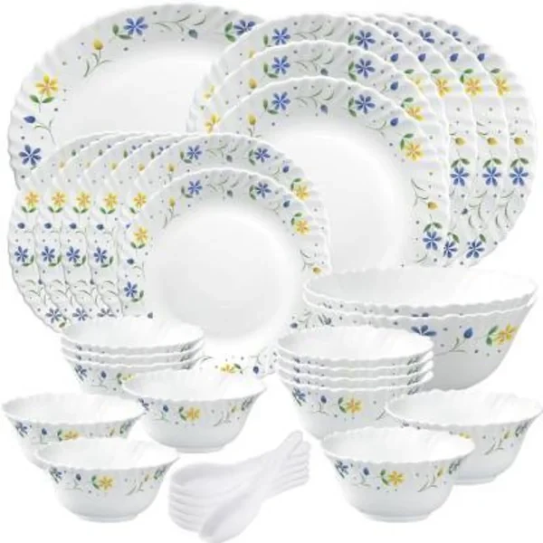 The stain resistant, non-porous and non-toxic material used in La Opala dinnerware makes it a durable and versatile set even for everyday or occasional use. Perfect in its simple design and lightweight nature for ease of use, this chip-resistant La Opala dinner set is a great buy This dinner set includes 6 Full Plates, 6 Quarter Plates, 6 Veg bowls, 6 Soup bowls , 6 Soup spoons, 2 Serving bowls, 2 Serving bowls cover and 1 Rice plate The LaOpala Dinner Set is resistant to thermal shock. So, even when you heat food in it using the microwave, it will last long while offering you hygiene and safety each time. It is FDA-approved and fade resistant to last you longer than ordinary dinner sets. The shiny opal glass finish and the pristine white colour together is sure to add a class to your table. Set your table in style with the dinner set and make the spread look more appealing. Make your everyday dining affair a special one with the Dinner set And serve food in an enticing manner.