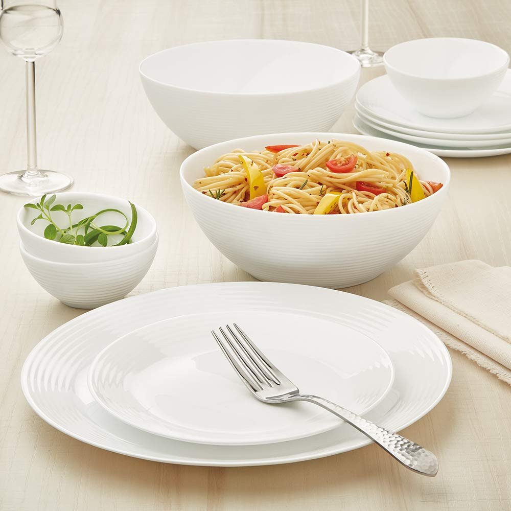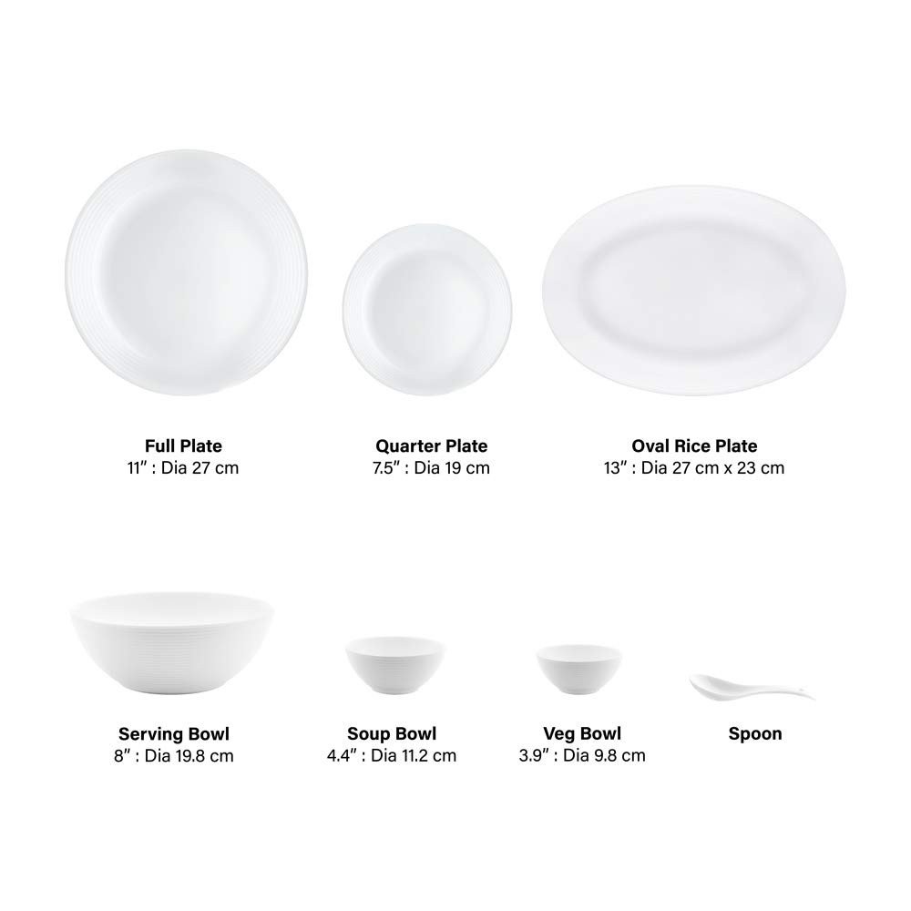 Package Contents: 6-Piece 11'' Full Plates, 6-Piece 7'' Quarter Plates, 1-Piece Rice Plate, 2-Piece 8" Serving Bowls, 6-Piece 5" Soup Bowls, 6-Piece 4.5" Veg Bowls, 6-Piece Spoons
