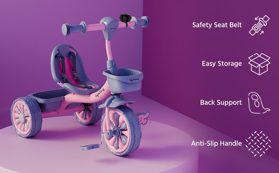 Our kids’ bikes ensuring the utmost safety for infants and toddlers. With Lifelong Tricycles for Kids 2-5 years, we take pride in crafting products that not only provide countless hours of fun but also prioritize your child's comfort besides helping the parents with the easy storage baskets, and back support and the handle fitting knob for the kids.