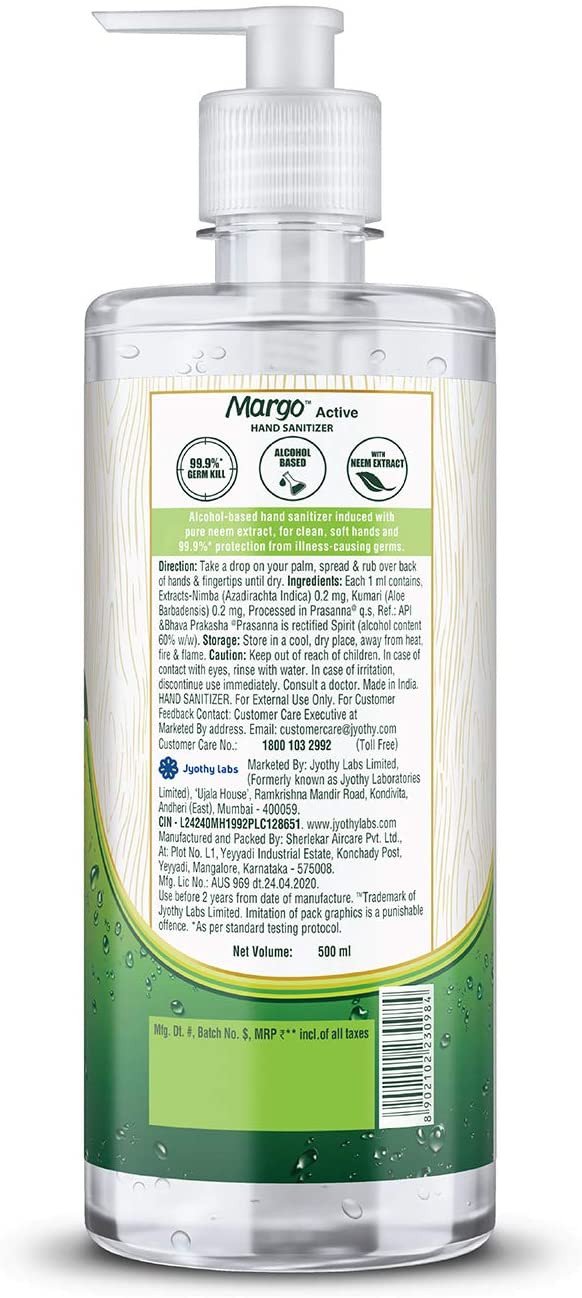 - Alcohol-based instant Margo Hand Sanitizer comes with the goodness of pure neem extracts.99.9% protection.