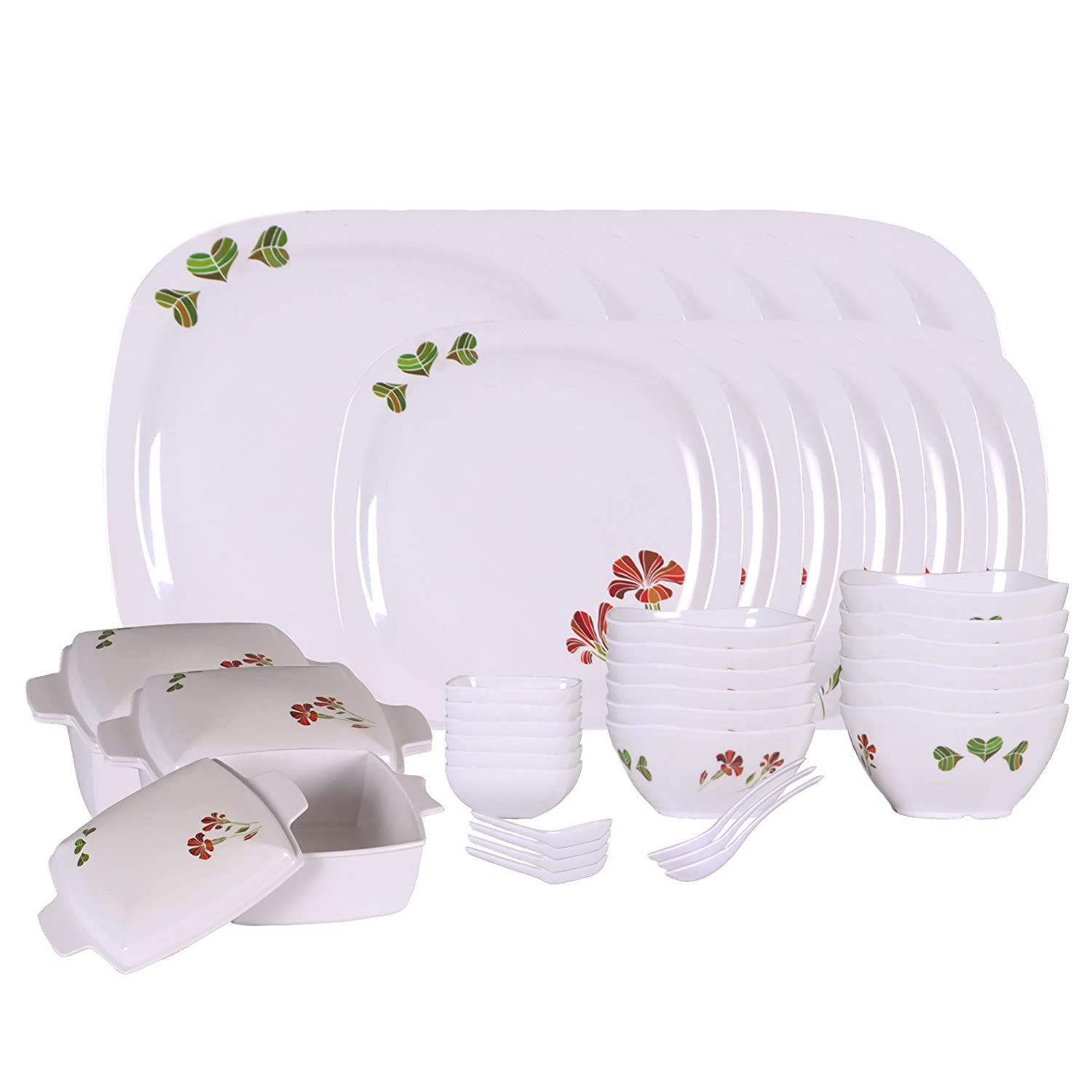 Package Contents:- Dinner Plates - 6 pcs, Quarter Plates - 6 pcs, Veg Bowl - 12 pcs, Serving Bowl - 2pcs, Bowl Lid - 2 pcs, Rice Platter - 1 pc, Serving Spoons - 3 pcs. Rice Spoon -1pc.