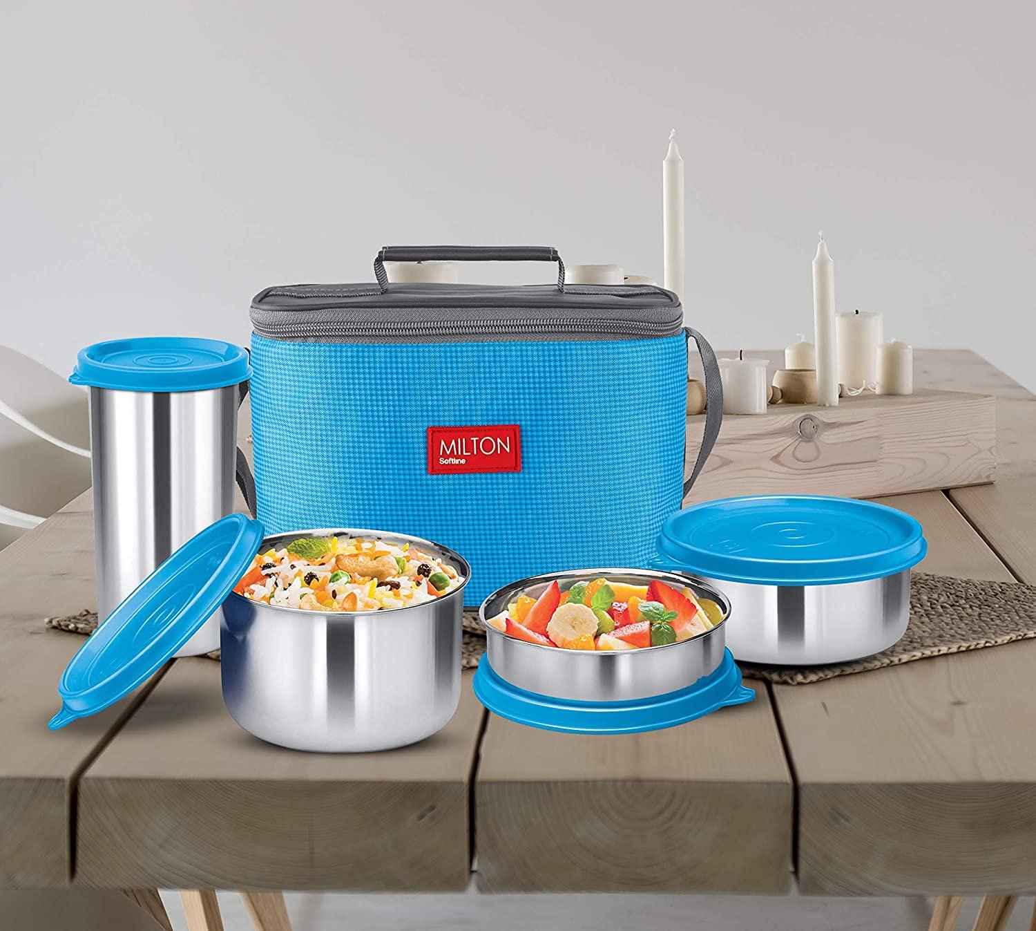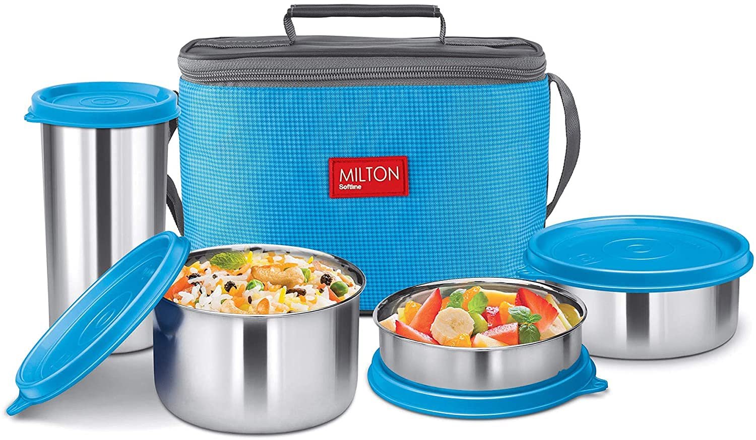 Introducing Steel Softline Tiffin series from the house of Milton. Delicious Combo is an ideal choice to carry home-made food in 100% leak-proof stainless steel containers. It comes with 3 stainless steel round containers along with a stainless steel tumbler. The outer jacket is made of finer quality and trendy fabric and high grade insulation that keeps contents hot and fresh for long hours. The stylish design and select colours of jackets make it a perfect meal companion.