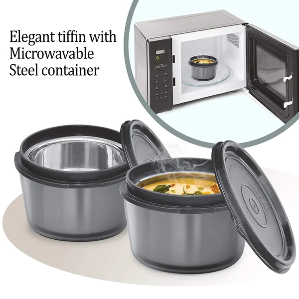- Materia type: Stainless Steel; No. of containers: 2; Capacity of containers: 2 Containers: 320ml Each; Contents include: 2 Tiffin Box (320ml) + 1 Bag; Colour: Grey