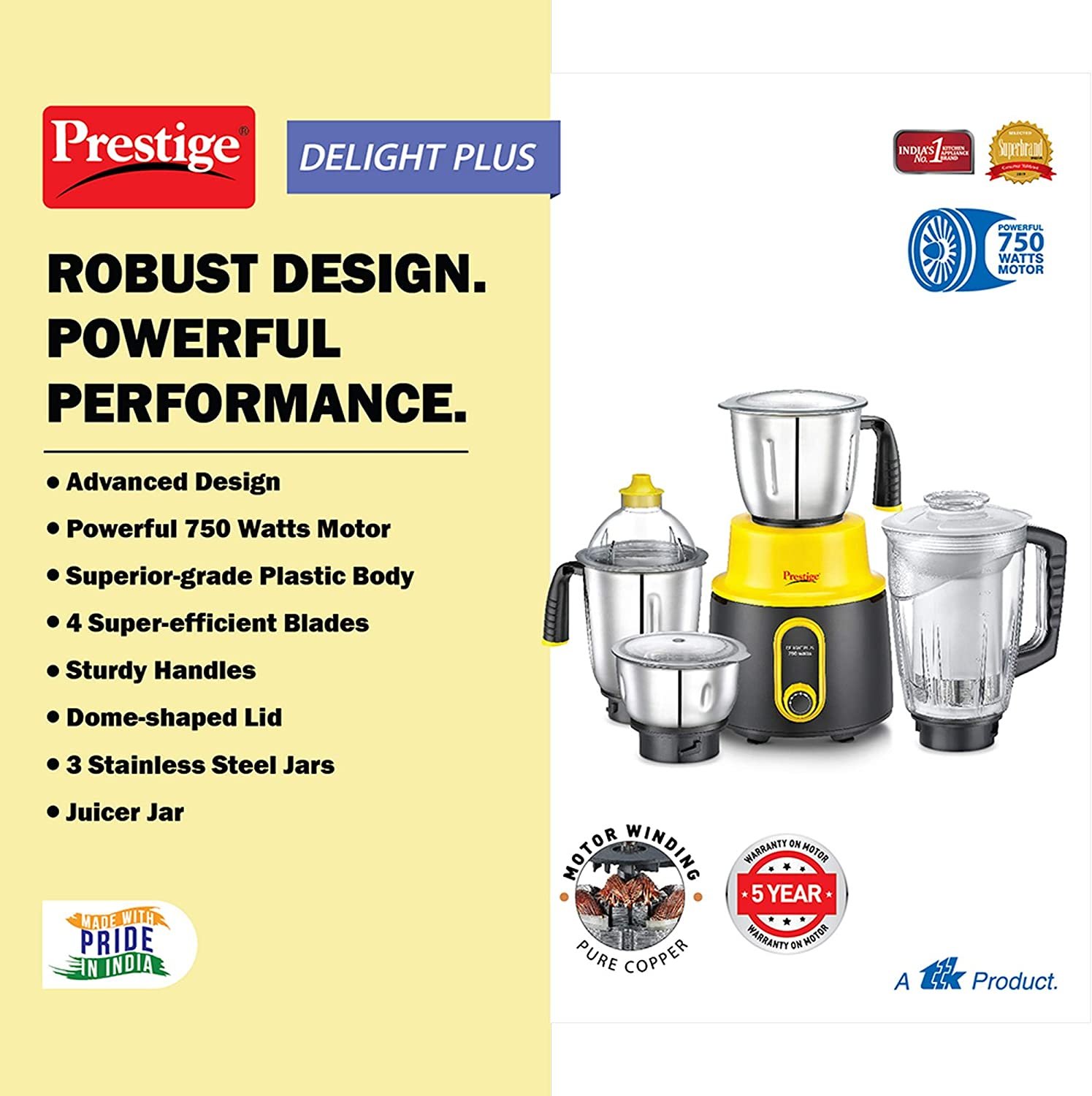 • Robust Design, Powerful Performance! Presenting, the new Prestige Mixer Grinder that can take care of all your grinding needs, and look stunning while doing so. Embodying true versatility this mixer grinder, powered by a 750 watt motor can grind both wet and dry ingredients. Now, you can have chutney for your dosas, powdered masala for your curries, and more!