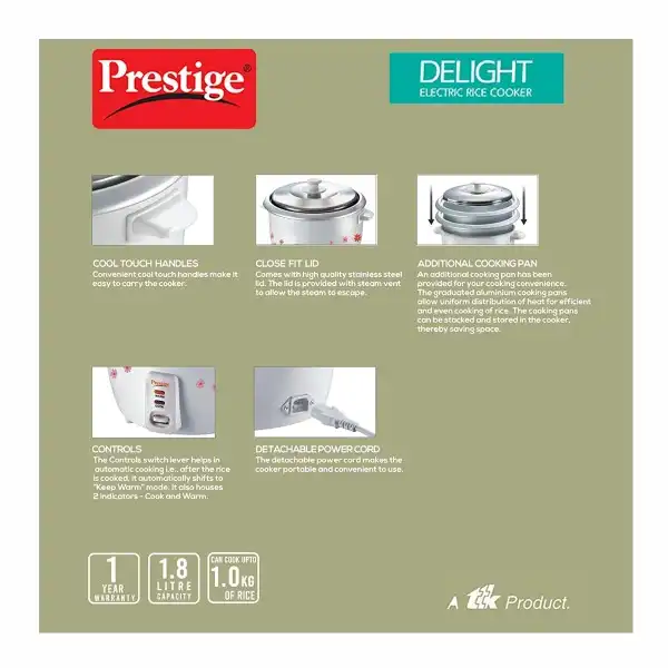 - Content: Prestige Delight Electric Rice Cooker (1.8 Open Type with Aluminium Cooking Pan-2U)
