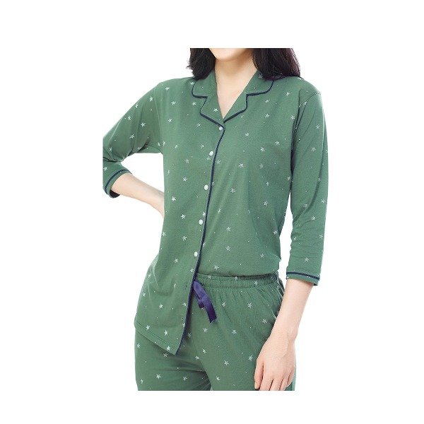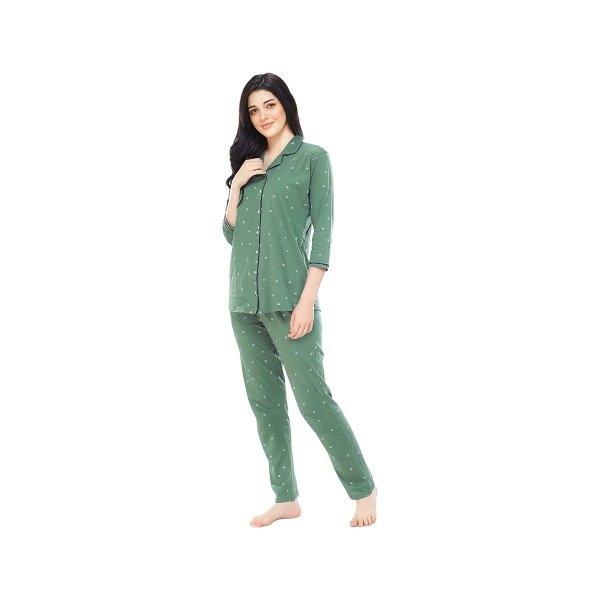Upgrade your sleepwear collection with this stylish and comfortable Women's Green Cotton Star & Dot Printed Night Suit Set. The high-quality cotton material ensures a soft and comfortable feel, while the stylish star and dot print design in beautiful shades of green add a touch of elegance to your nightwear. The set includes a full-sleeve shirt with button closure and a matching pyjama with an elastic waistband for a snug fit. The lightweight and breathable fabric is perfect for a comfortable night's sleep, making it ideal for both summer and winter seasons. The shirt has a classic collar and a front pocket for added convenience. It is easy to wash and maintain, retaining its softness and color even after multiple washes. Whether you're lounging at home or looking for a stylish nightwear option, this Women's Green Cotton Star & Dot Printed Night Suit Set is the perfect choice. Shop now and experience the comfort and style of this exquisite nightwear set.