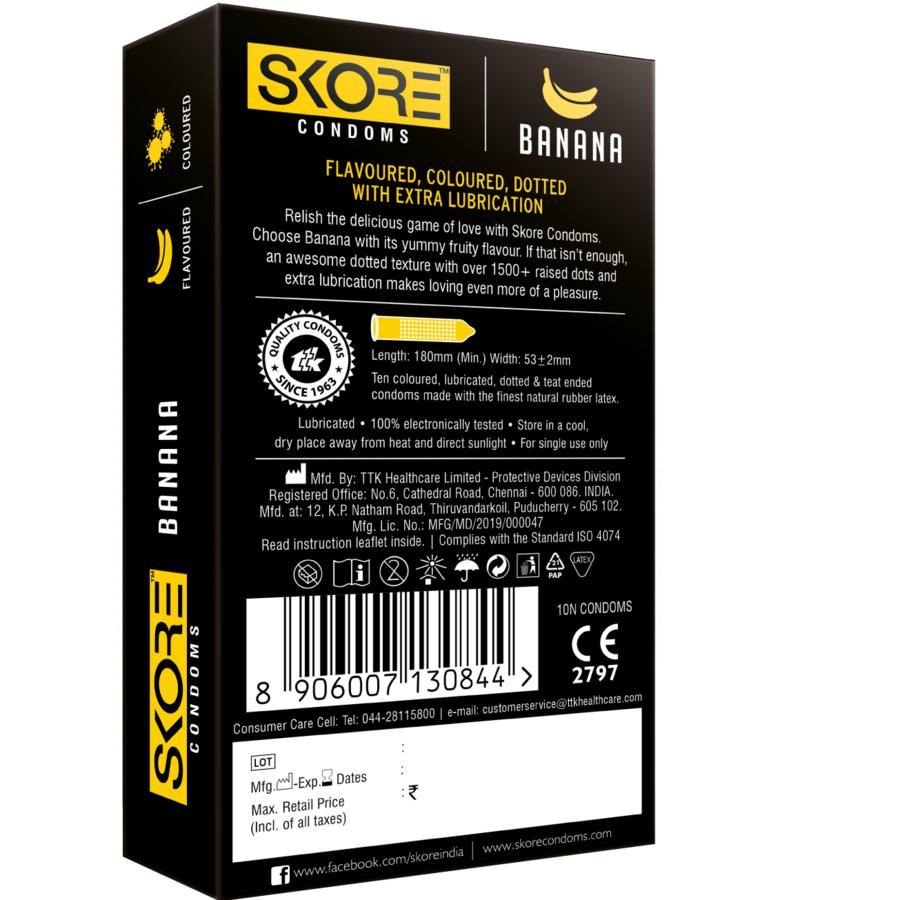 Skore Dotted & Coloured Condoms - Banana Flavored makes you score more in the game of love. It makes lovemaking more special with its fruity Banana flavor. It adds just the right amount of sweetness to a wayward night. And for that additional zing, it comes with a dotted texture and cool colors.