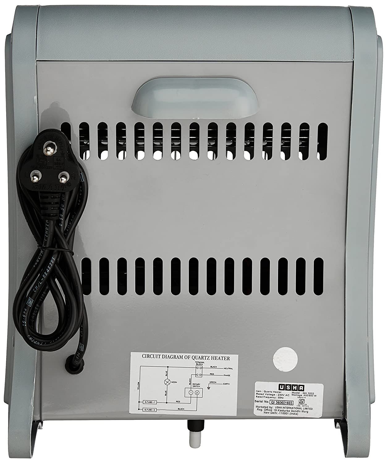 Manufacturer Usha, USHA International LTD.Plot No. 15, Instituitional Area, Sector 32, Gurugram 122 001, Haryana(India), Tel +91-124-4583100 Registered Office: Surya Kiran Building 19, Kasturba Gandhi Marg, New Delhi(India) 110 006