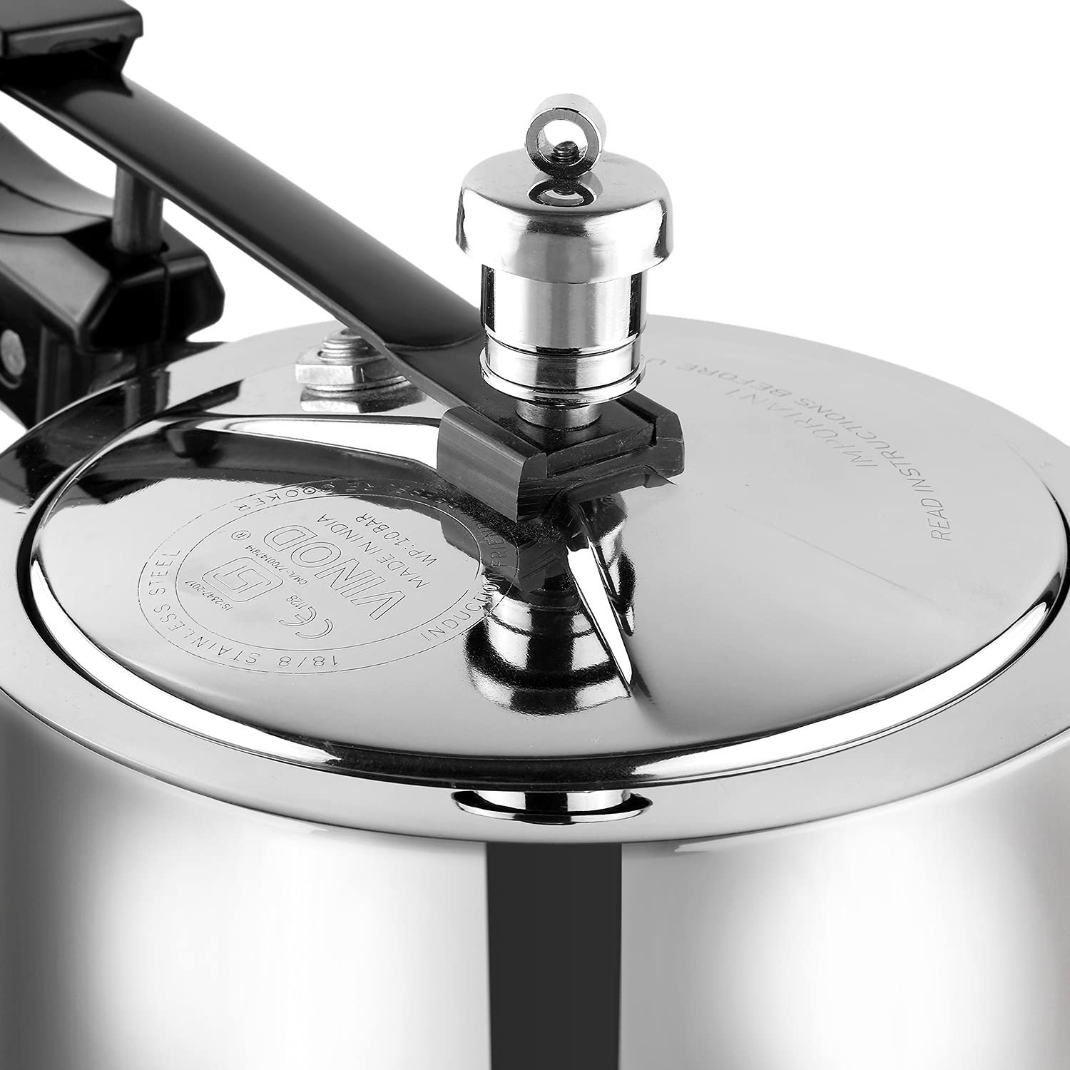 Engineered with the unique impact bonding process, the middle layer of aluminum is sandwiched between the two stainless steel layers. This sandwich bottom technology, implies no hot spots, even distribution of heat where food will not burn or stick. The extra thick heavy bottom also allows much faster cooking, which saves a lot of fuel and time.The thickness at the base is 6.7 mm. This helps in hiding the aluminium which tends to show pit marks, corrodes or looks dirty over time. This also allows you to use these stainless steel pressure cookers on induction and gas cooktops.