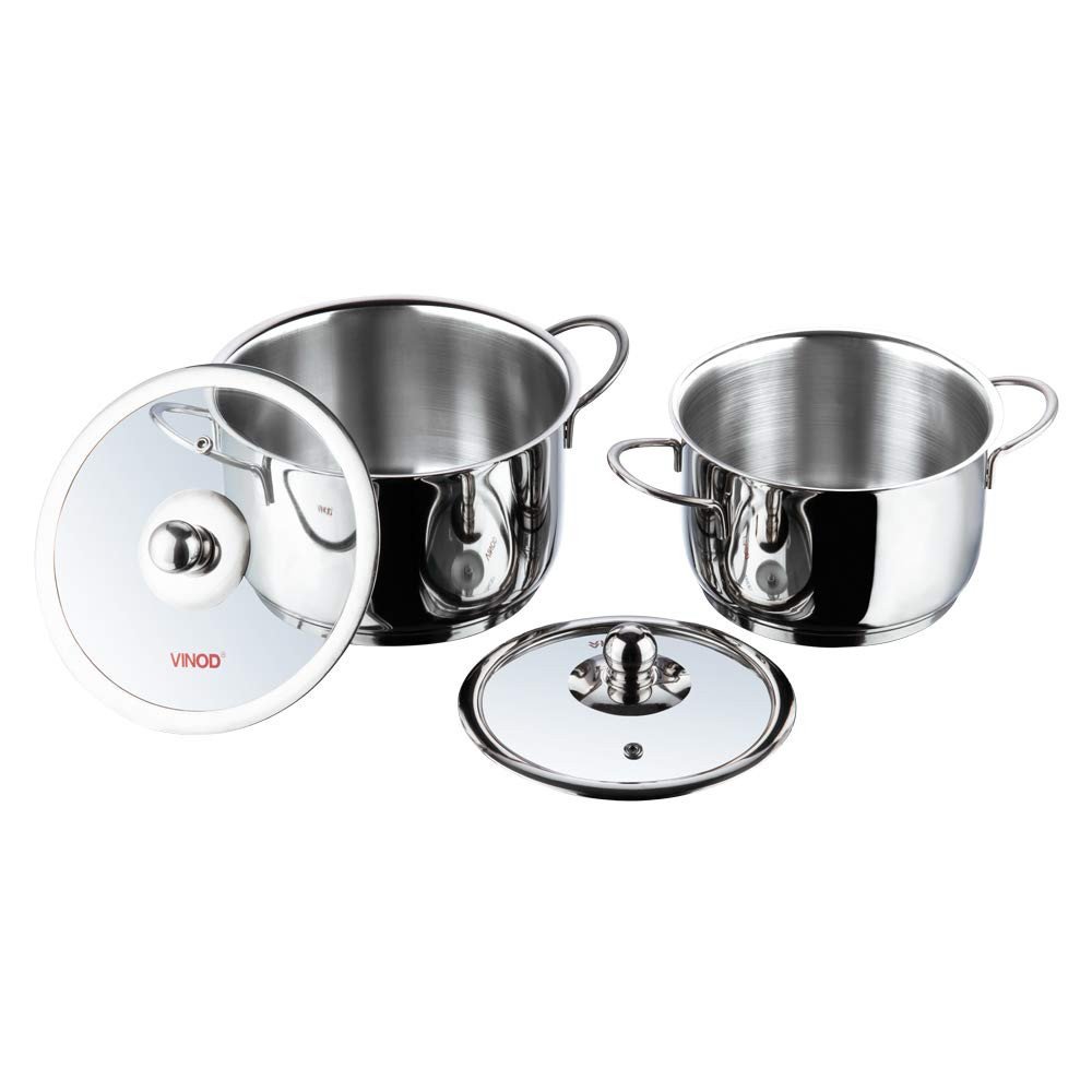 These stainless steel cooking pots are a feature rich product that not only rates high on durability and looks but also performance and usage. The 2 piece cooking pot set has a 5mm impact bounded heavy thermal base that aids in faster and uniform heat distribution. This not only helps in faster cooking but also consumes lesser energy and thereby is far more economical than using regular pots. These pots consist of lids made from tempered glass that have small vents for letting steam out while cooking.