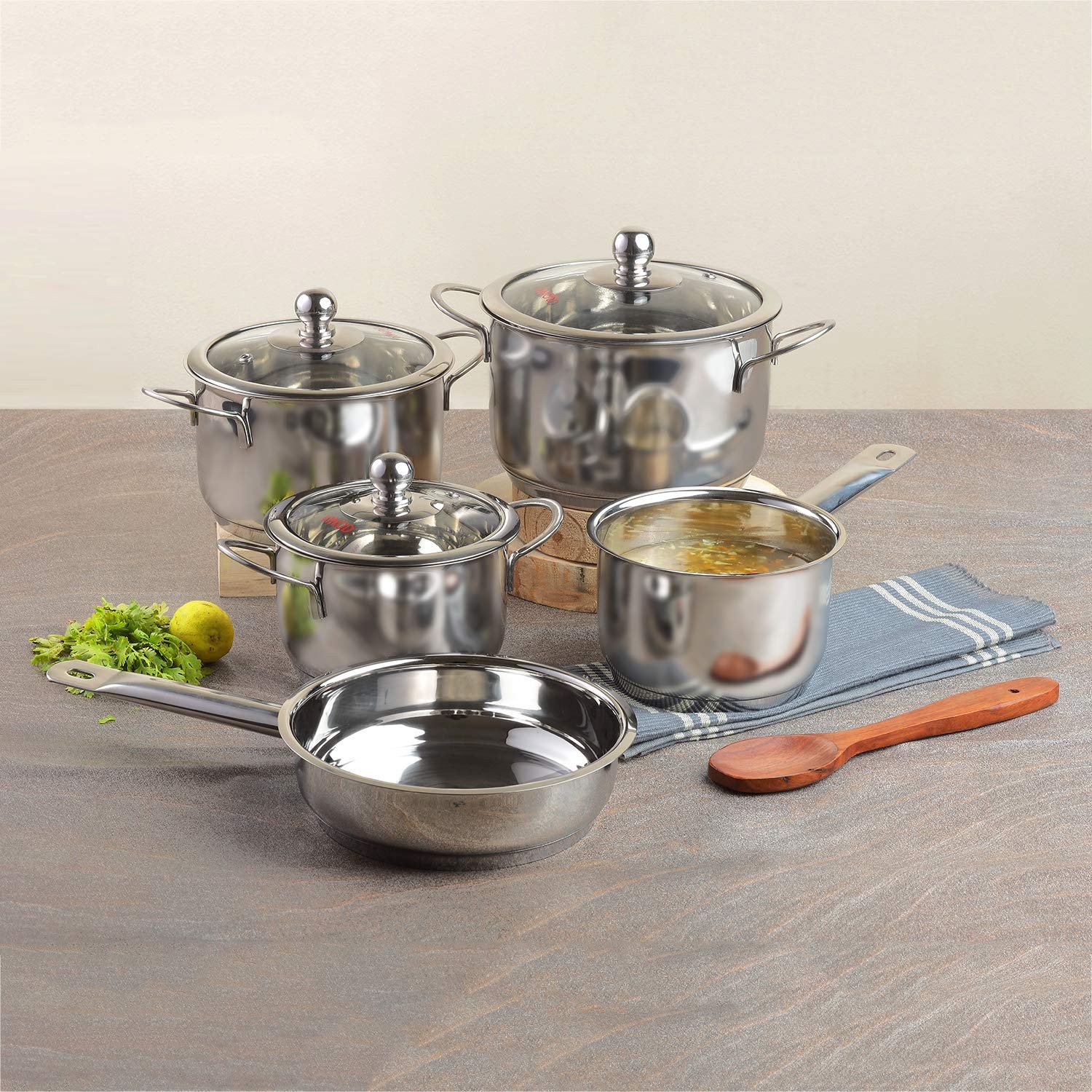 It is the new cooking rage in this fast-paced world. For easy and quick cooking, shift to stainless steel cooking pots. Even if you are cooking on gas, the Vinod Cookware tuscany set is a good choice as it is suitable for all heat sources. The stainless steel pot set contains five pieces that take care of all your cooking needs. It has a 5mm impact-bound heavy thermal base to make sure energy is used optimally and heat is distributed evenly to its contents. Plus, it is easy to clean and hygienic too.You can shallow and deep fry, make daal and rice and spread out a grand feast in no time with this no-fuss set. The cooking pots are extra deep and made of robust material so they are durable and will churn out a filling meal. Tempered Glass lid with Steam Release Vents. Excellent Quality, Easy to clean and hygienic Stainless Steel