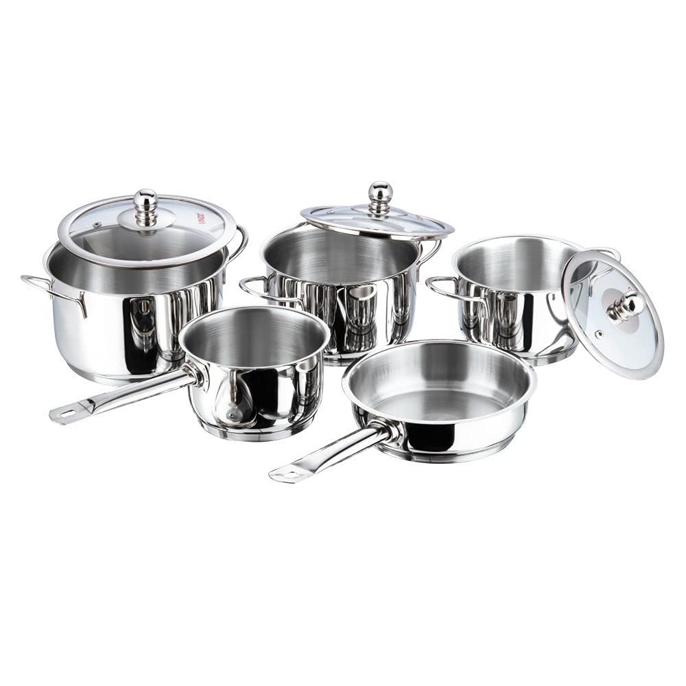 Vinod cookware set is a set of five cooking pots that are made of stainless steel. These pots are ideal for cooking a number of dishes, including Indian and continental cuisine, and are provided in a number of sizes that can be used according to the quantity being cooked. All of the cooking pots are induction friendly and can be used on every heat source.These cooking pots have been constructed in such a way that they are extra deep and very strong, making them ideal for everyday use. Each of them has a 5mm impact bounded heavy thermal base, which is helpful for even heat distribution while cooking. This is helpful for optimal energy usage as well. This means that it facilitates fast cooking, which in turn saves fuel or electricity. All of these cooking pots have tempered glass lids with steam release vents. They are made of stainless steel and are silver in color. Vinod cookware induction-friendly set has a shiny finish and is thus very easy to clean with soap and water. This set includes 14cm Saucepan with Tempered Glass Lid ,14cm, 16cm and 18cm Casserole and 18cm Frypan .These cooking pots come with a two year warranty. Each of them has handles on one or both sides that make it easy to grip the vessel while cooking or serving.Product Features- Come with tempered glass lids that have steam release vents. Made of stainless steel. Are capable of being used on various heat sources. Are silver in color. Includes cooking pots of various sizes.